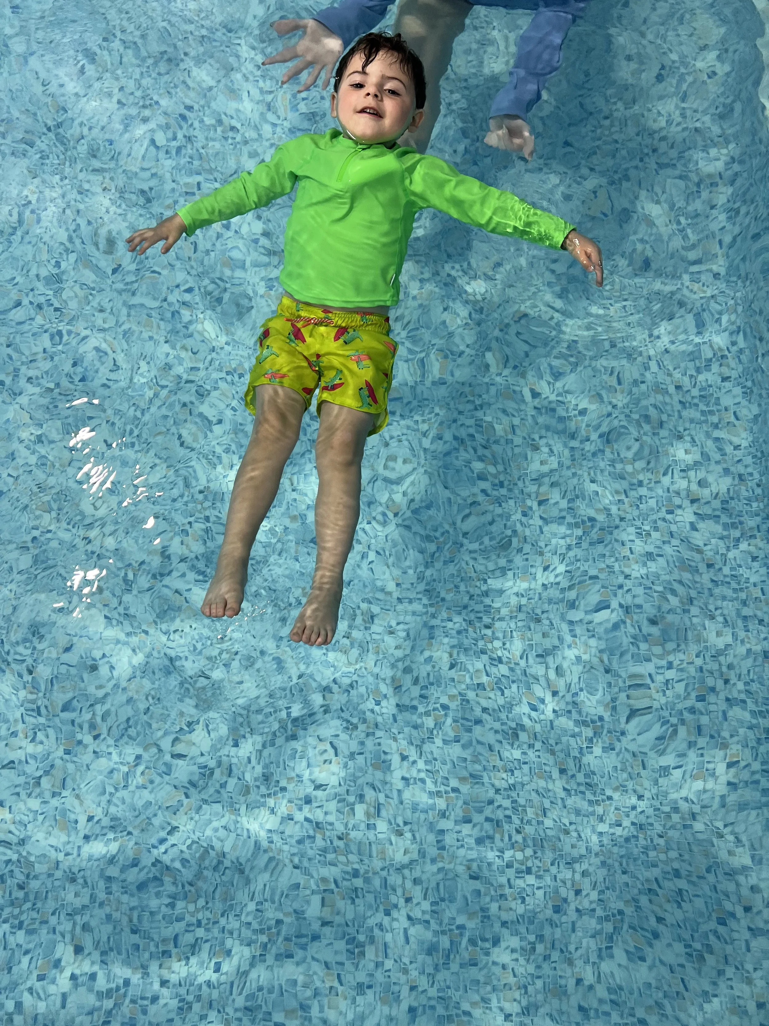 Our above-ground pool is heated at 85-90 degrees year-round and is 3.5" deep. Making it the perfect temperature and depth for your little ones to gain confidence and skills in the water!