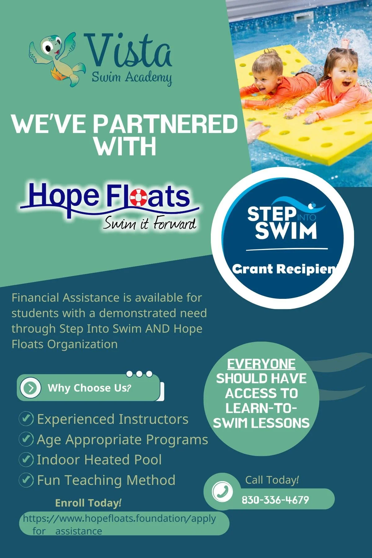 Vista Swim Academy empowers children to become confident, safe, and joyful swimmers through developmentally focused instruction, warm-water learning, and a supportive family-centered environment.